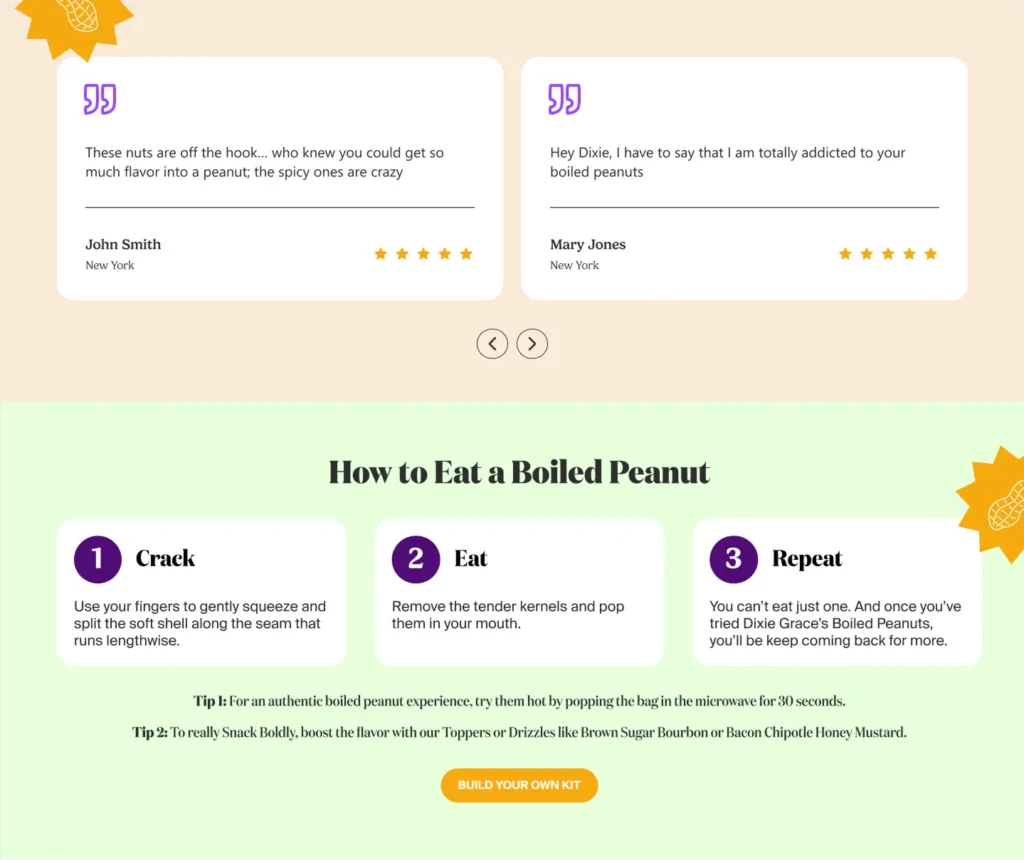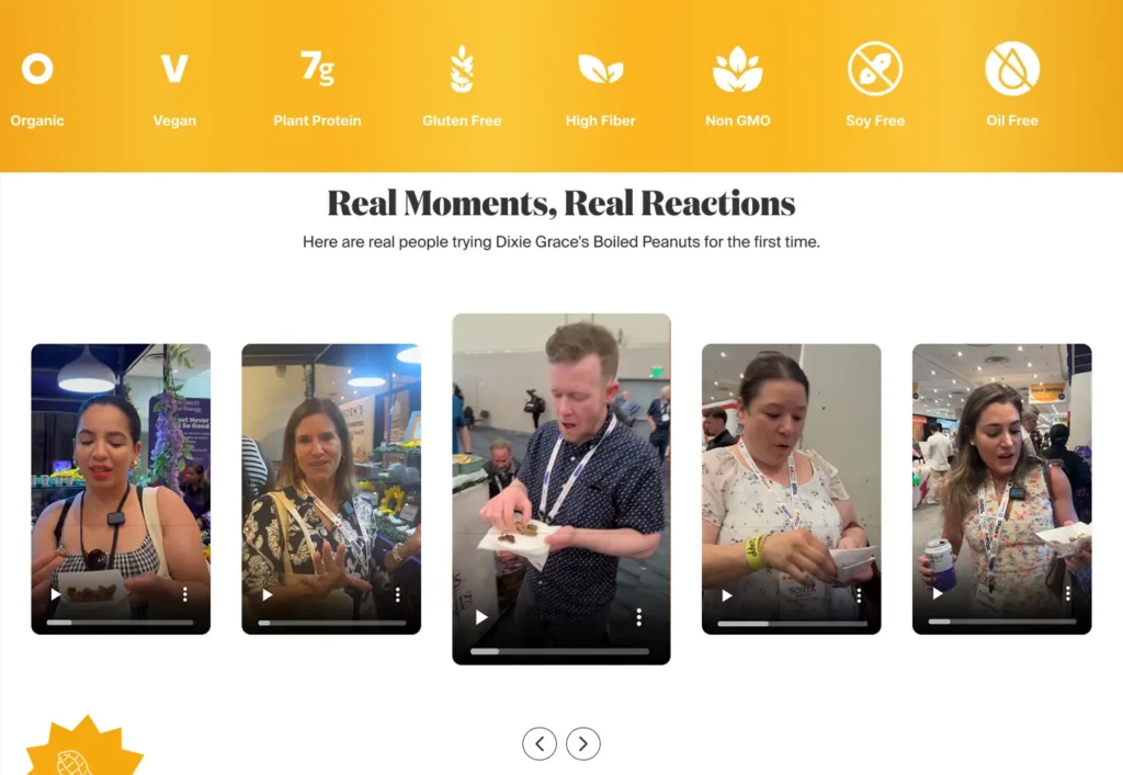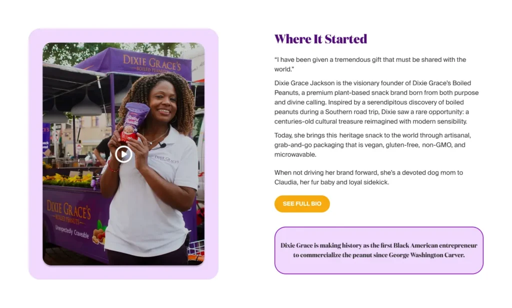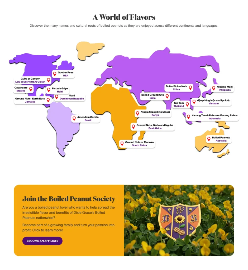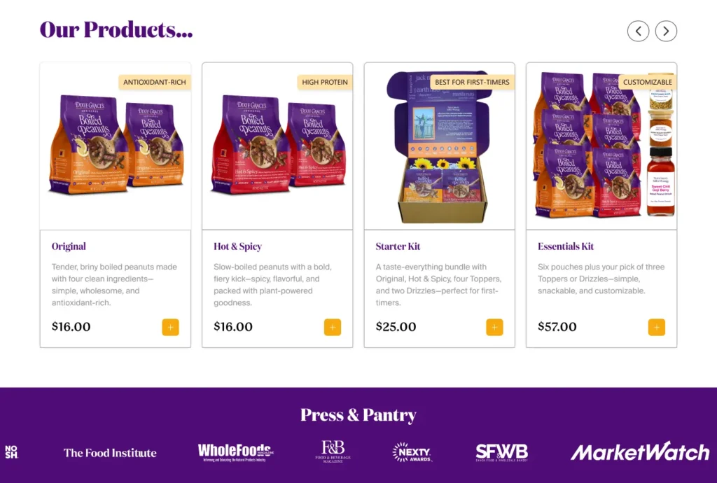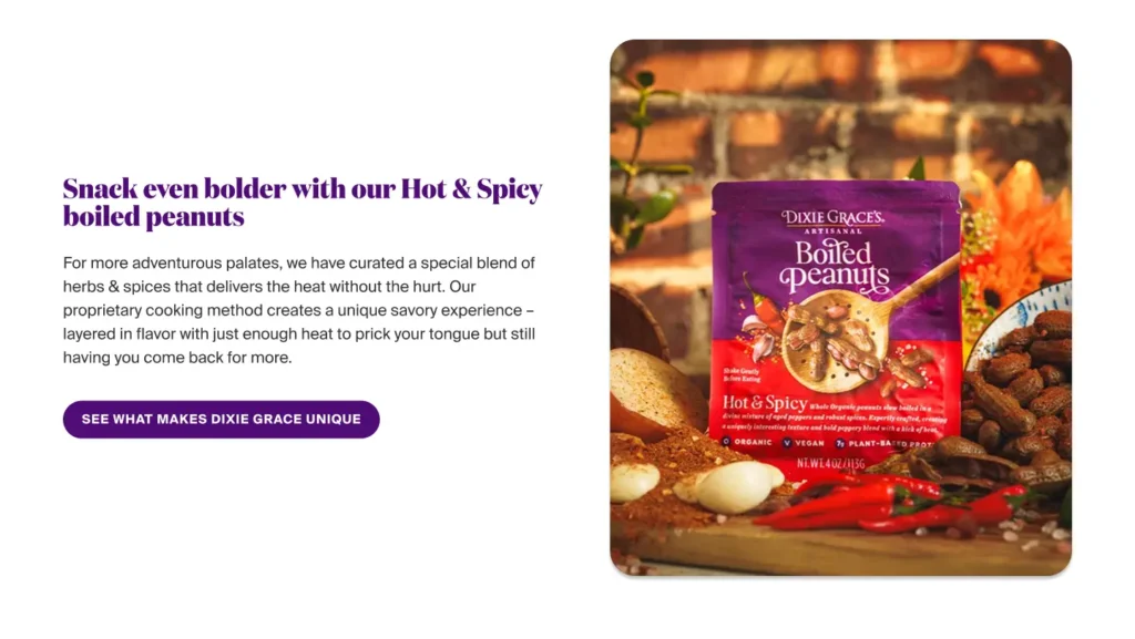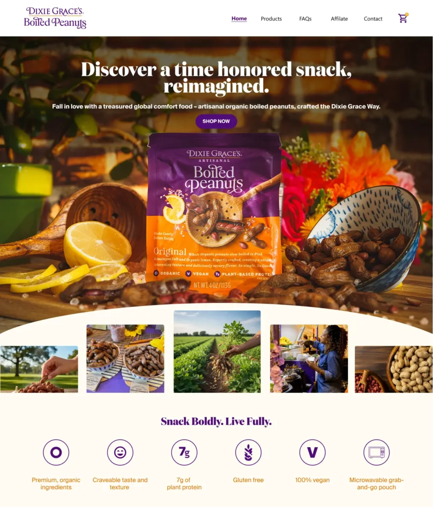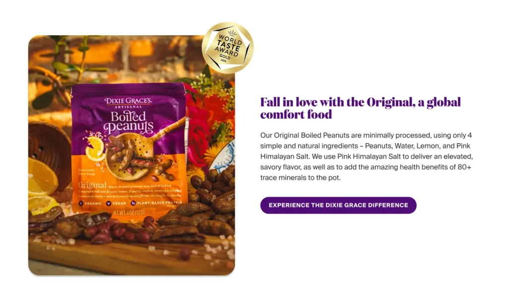 Currently, the homepage does not reflect Dixie Grace’s premium positioning. The amateur design and lack of visual cues connected to the peanut’s origins impact both brand experience and commercial performance.